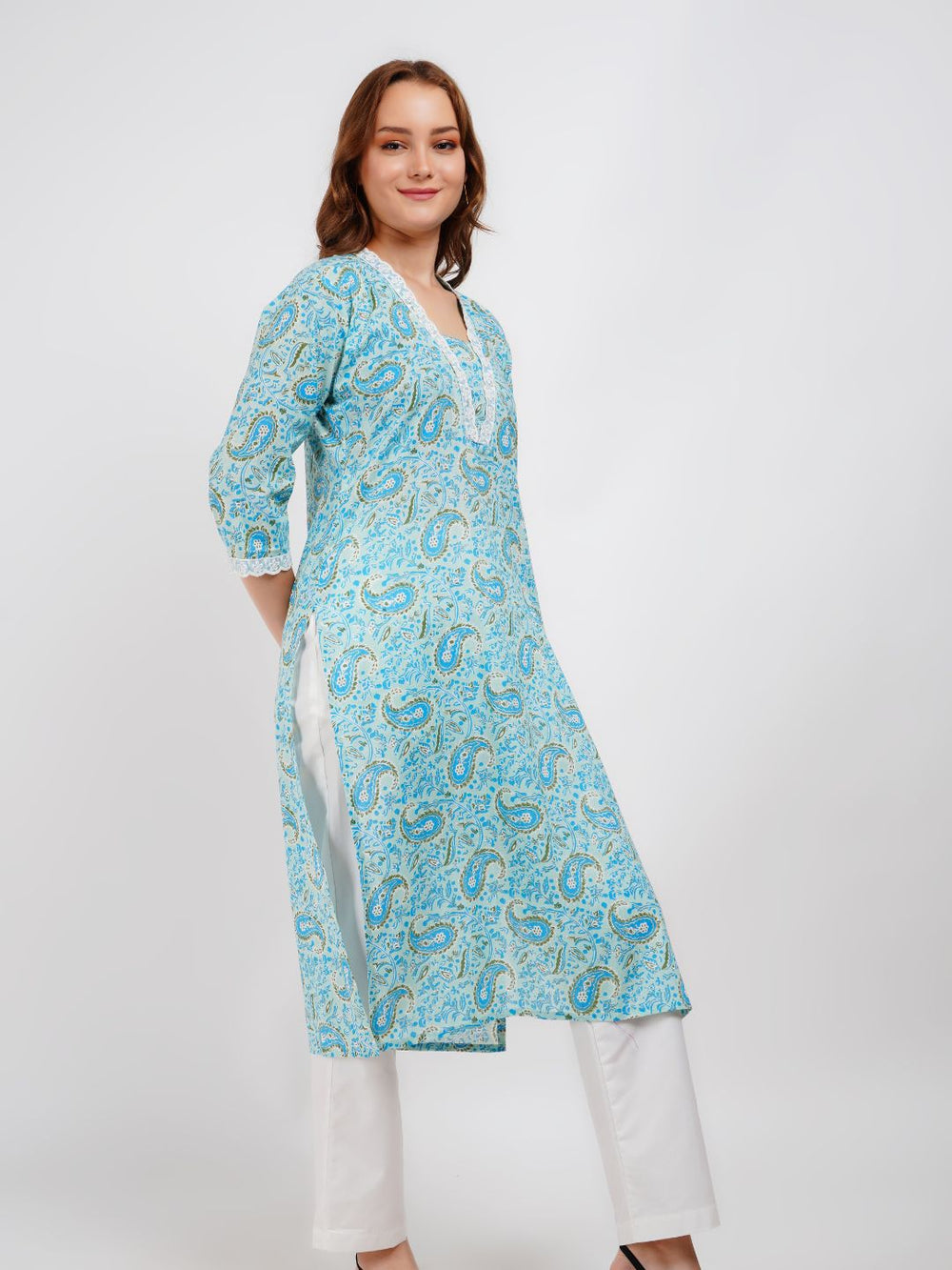 - Description: This Light Blue straight kurta is made with comfortable cotton fabric, highlighted with beautiful Lace, three quarter sleeves and gorgeous print, this beatutiful style is perfect for any casual outing.