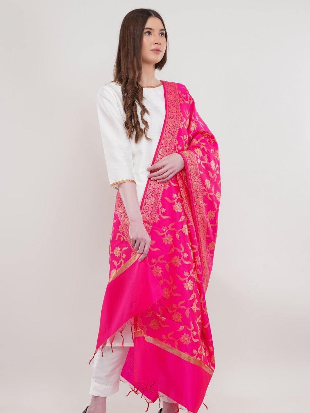 - Description: Our Magenta banarasi silk Dupatta Is highlighted with zari work and is perfect to make you ethnic look complete.
