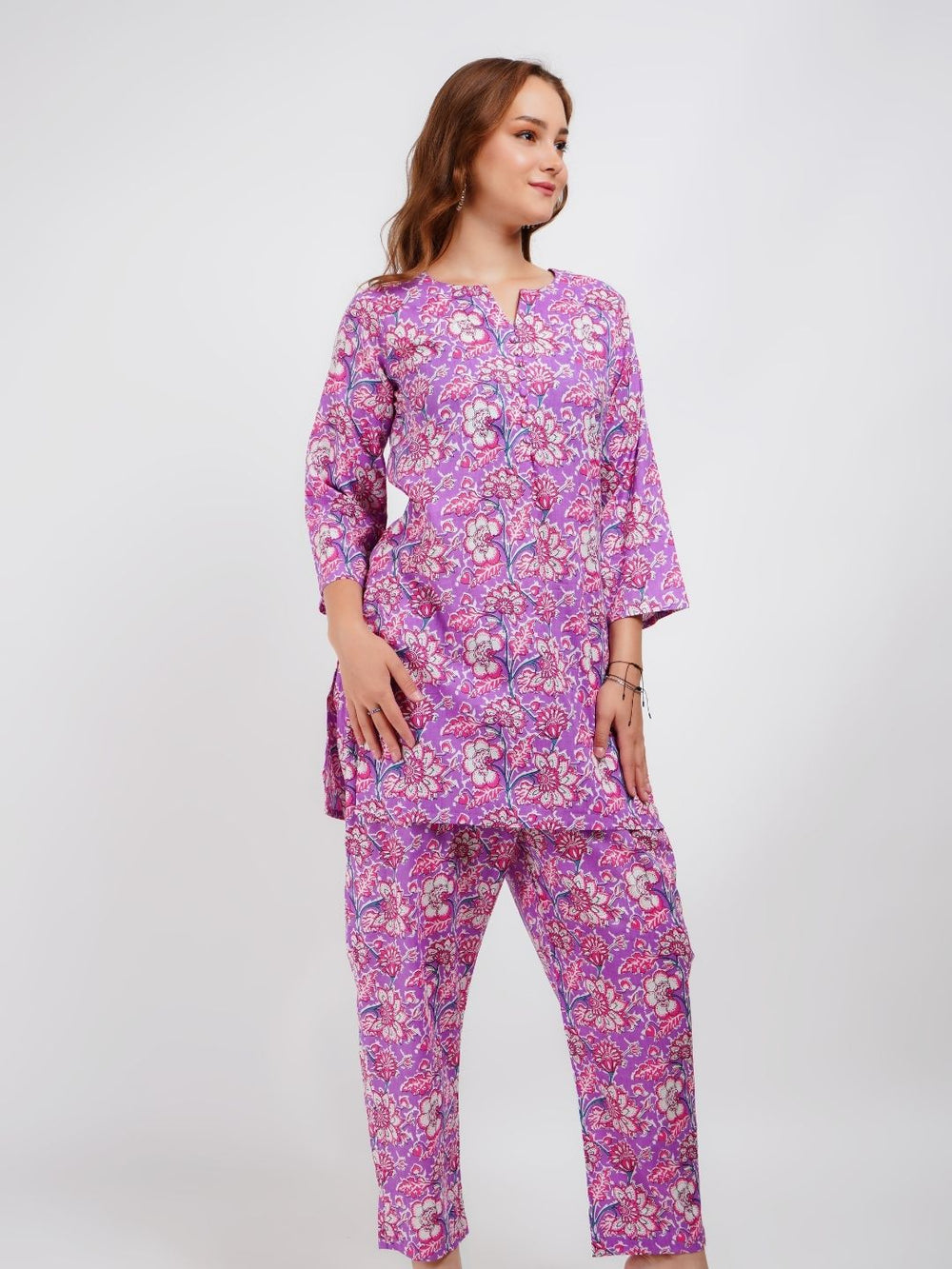 - Description: This 2-piece lavender printed co-ord set, made with soft cotton, features floral print with three-quarter sleeves. Complemented with trousers with a fully elasticated waistband, this style is perfect for any casual outing.