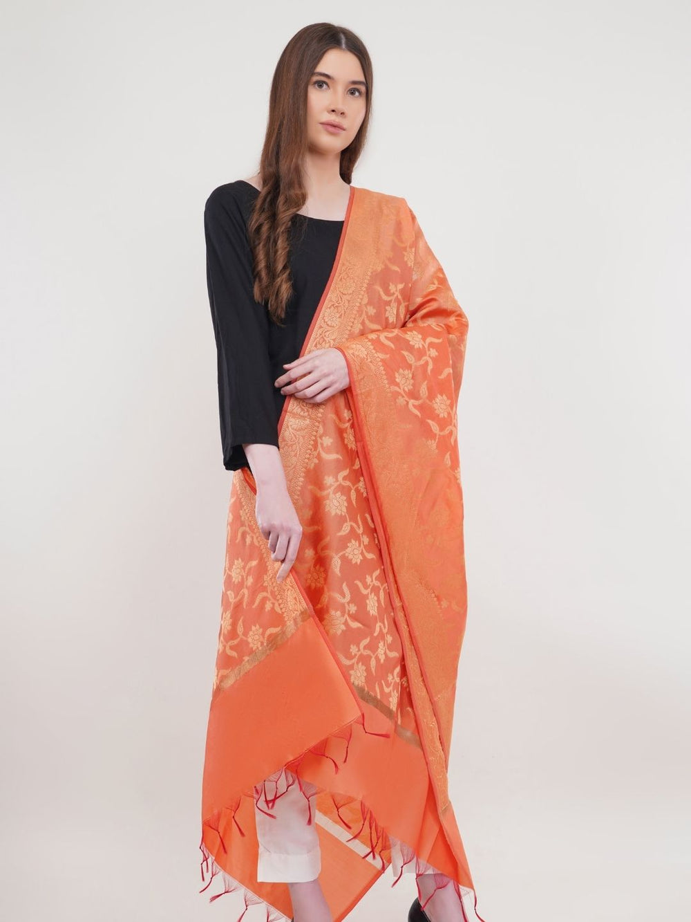• Description: Our Orange banarasi silk Dupatta Is highlighted with zari work and is perfect to make you ethnic look complete.