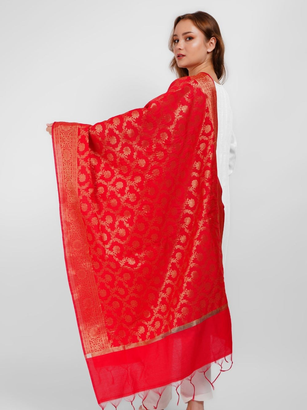 - Description: Our Red & Gold toned banarasi silk Dupatta Is highlighted with zari work and is perfect to make you ethnic look complete.