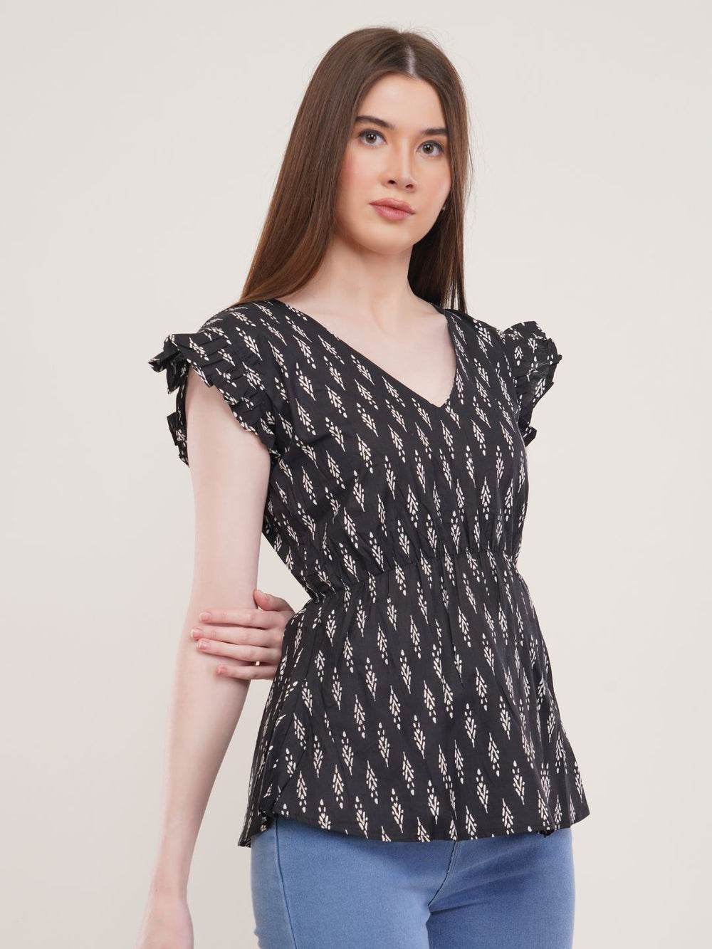 - Description: This black top by Lavantika is made with cotton fabric, featuring ikkat print, a V neck with fit & flare silhouette, is a perfect choice for any causal outing.