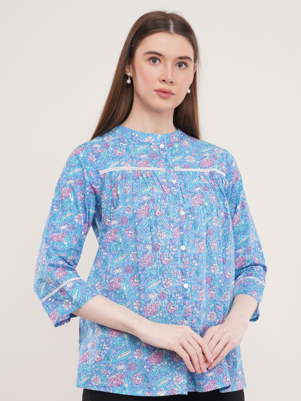 - Description: Our Blue top is crafted with cotton fabric, featuring beautiful floral print, mandarin neck, is a perfect choice for any causal or formal outing.