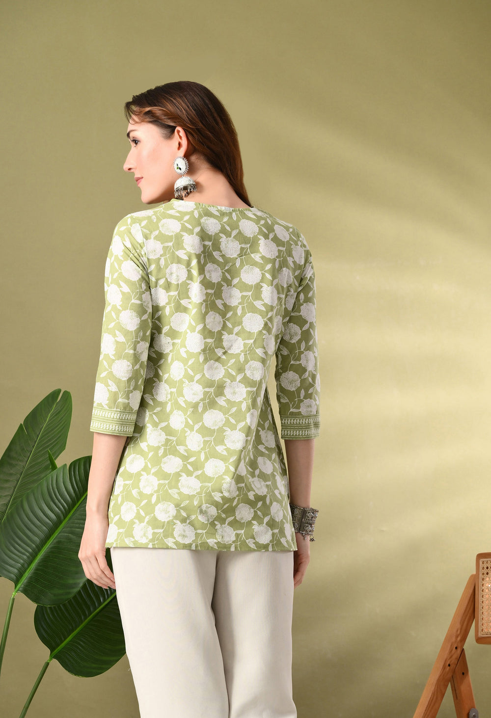Green Floral Print A-Line Cotton Top