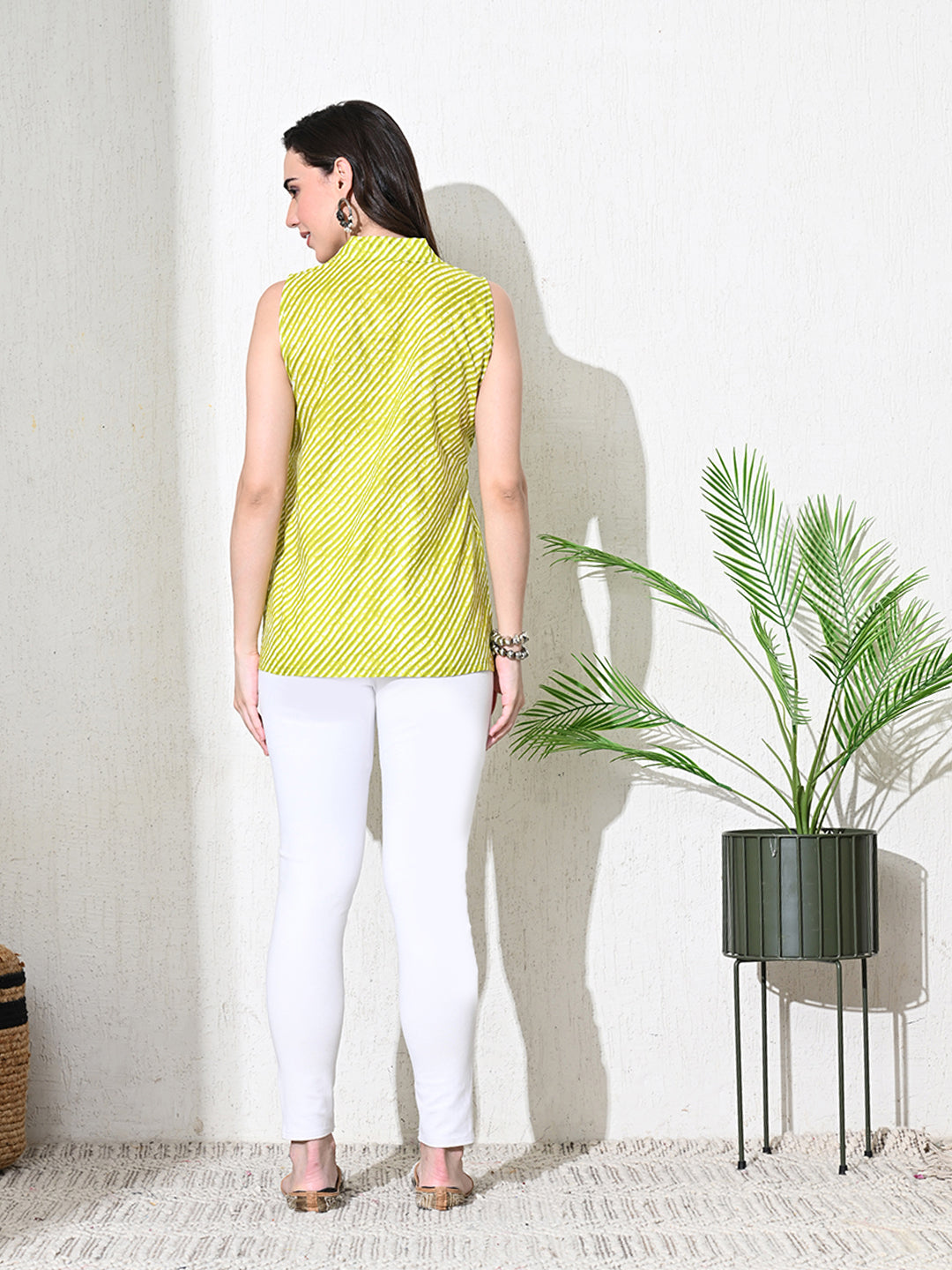 - Description: Refresh your wardrobe with this light green leheriya print top, inspired by the vibrant tie-dye traditions of Rajasthan. The soothing green hue paired with the signature wave-like leheriya pattern creates a look that’s both fresh and festive. Made from soft, breathable cotton, this top offers all-day comfort while keeping your style effortlessly chic. Perfect for casual outings, festive brunches, or relaxed summer evenings, it blends ethnic charm with modern versatility..
