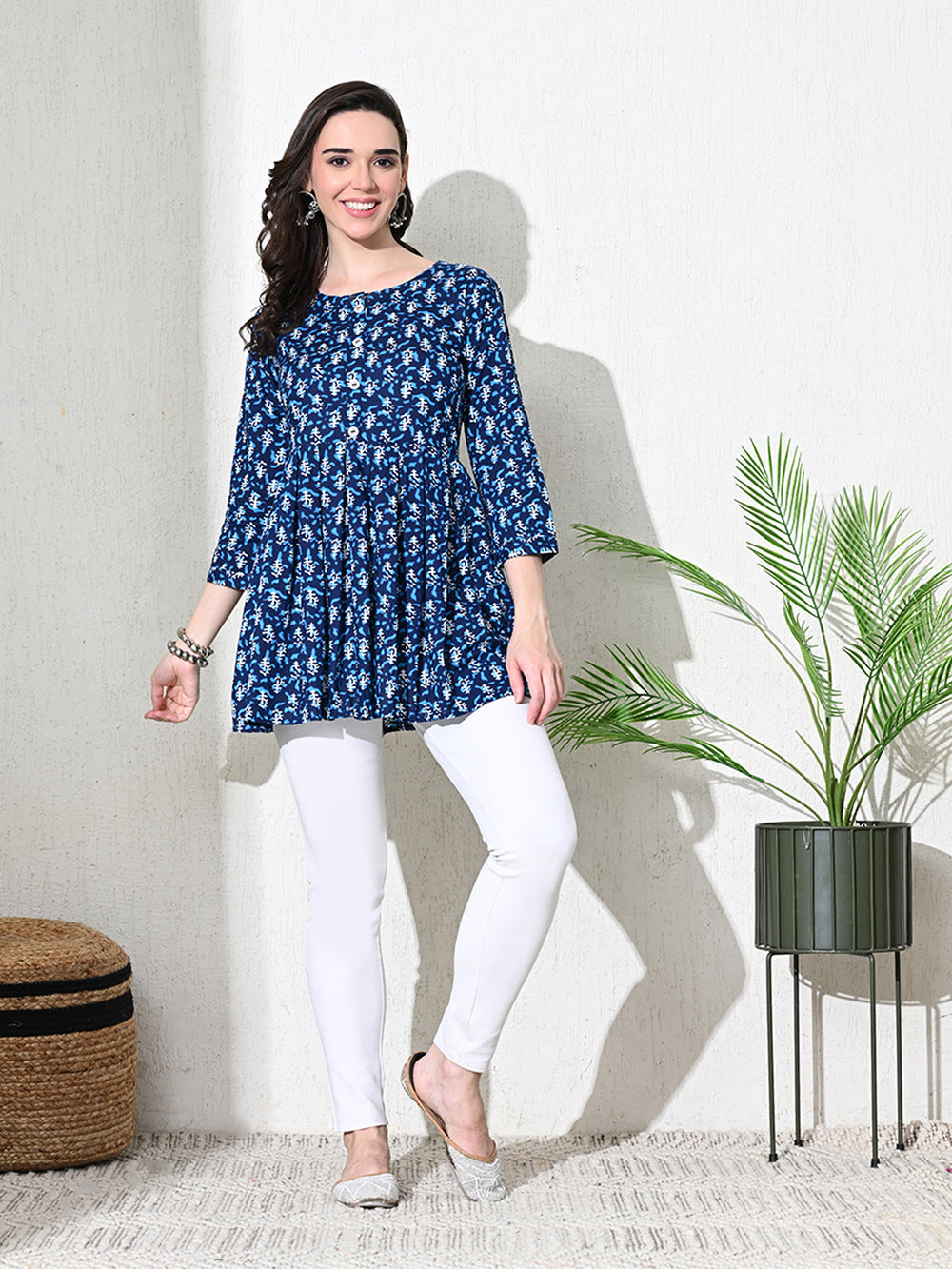 • Description: Step into effortless elegance with this blue empire-style top, beautifully adorned with authentic Jaipuri block prints. The mandarin collar adds a touch of sophistication, while the empire cut flatters your silhouette, making it both stylish and comfortable. Crafted from soft, breathable cotton, it’s perfect for all-day wear—whether you’re heading to work, meeting friends, or enjoying a weekend getaway. The blend of traditional Rajasthani artistry and a modern, versatile design makes this piece a timeless addition to your wardrobe..