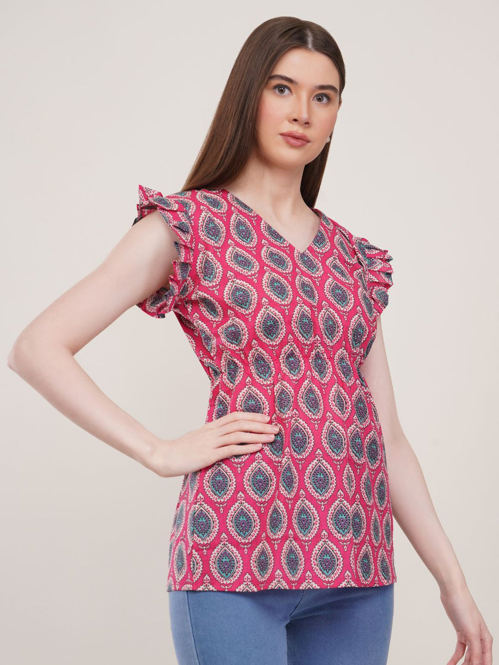 - Description: Pink printed top by Lavantika is made with cotton fabric, an over all print, featuring a V neck with fit & flare silhouette, is a perfect choice for any causal outing.