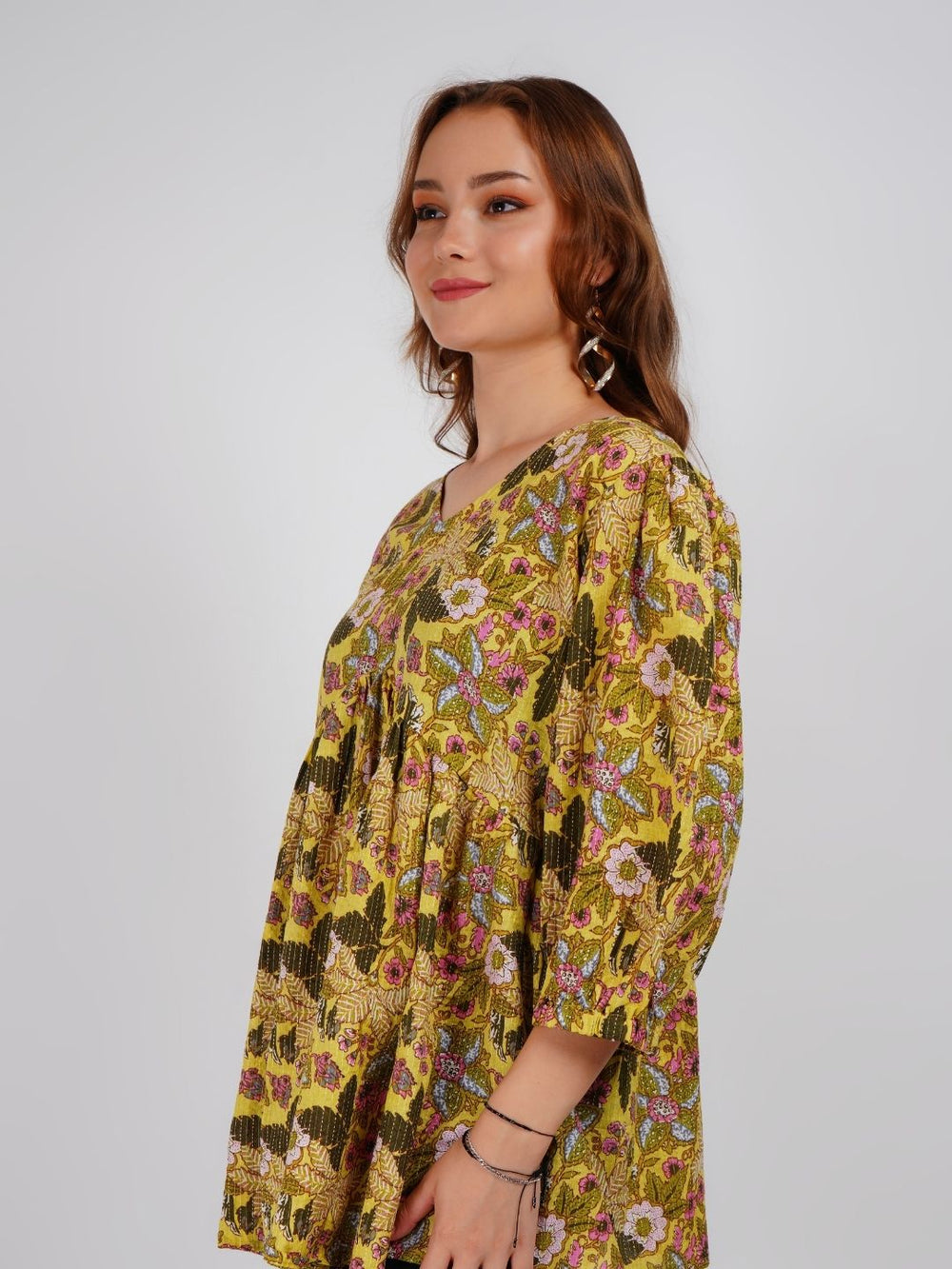 - Description: Our Yellow ethnic top is crafted with cotton kantha fabric, featuring beautiful floral print, V- neck, is a perfect choice for any causal or formal outing.