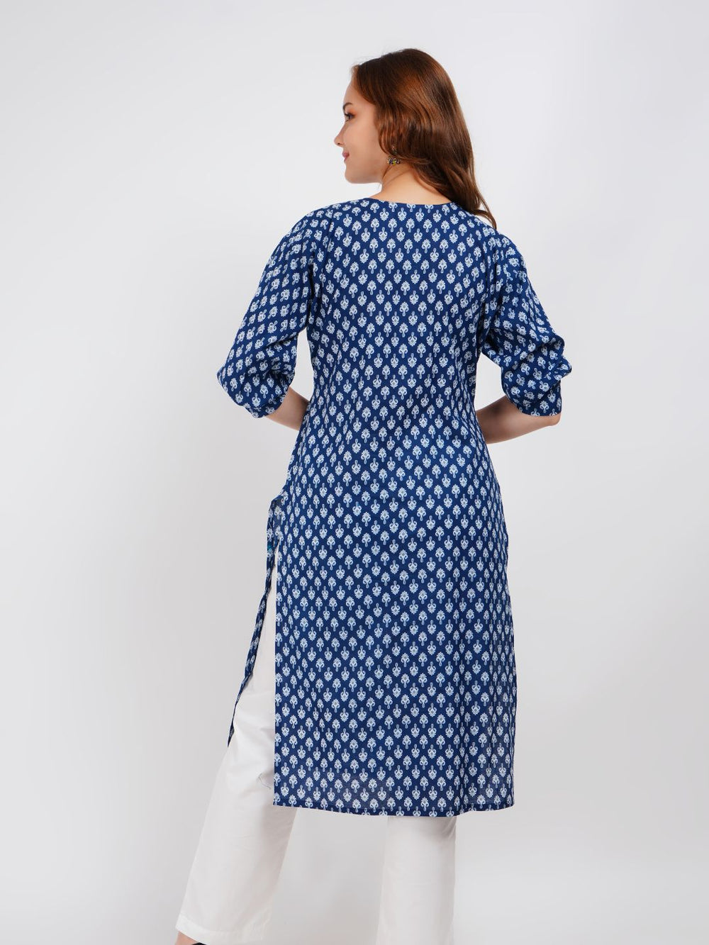 • Description: This Blue straight kurta is made with comfortable cotton fabric, highlighted with beautiful Lace, three quarter sleeves and gorgeous print, this beatutiful style is perfect for any casual outing.
