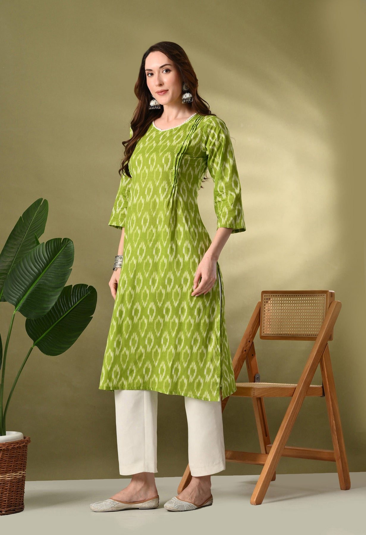 - Description: This beautiful green ikkat print cotton kurta features a v- neck and flattering flared fit, you can pair it with comfortable bottom of your choice & matching accessories and feel confident and stylish wherever you go. Made from soft cotton, it's a perfect choice for any casual or formal occasion.