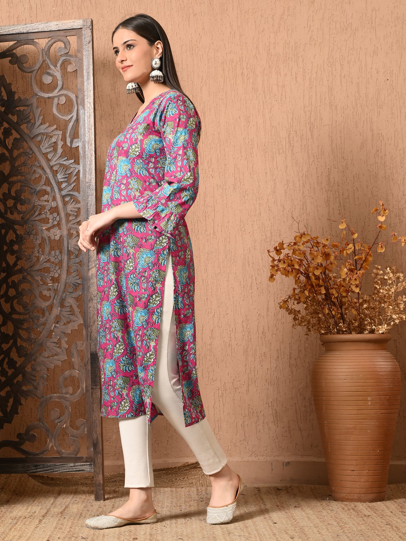 • Description: This beautiful pink floral print cotton kurta features a V-neck & a flattering straight fit, Made from breathable cotton, it's a perfect choice for any casual or formal occasion.