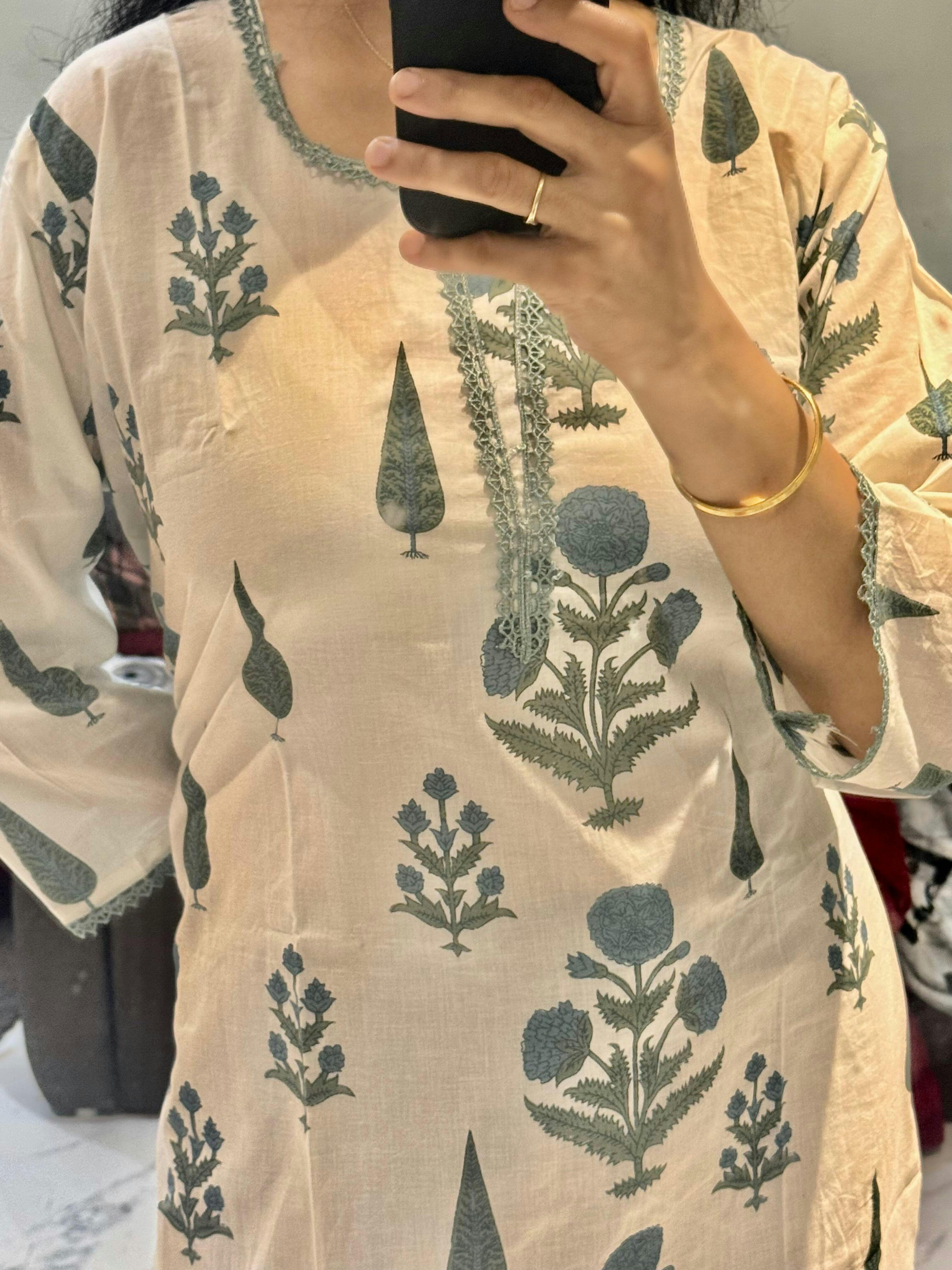 White Block Print Lace Work Kurta