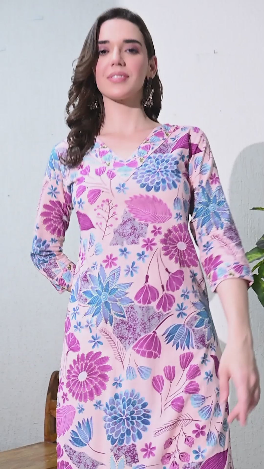• Description: Our stylish pink floral print kurta features a flattering straight silhouette, v- neck and is perfect for effortless daily wear. Crafted from soft, lightweight cotton and designed for lasting comfort, this classic kurta is the perfect choice for any casual or formal occasion.
